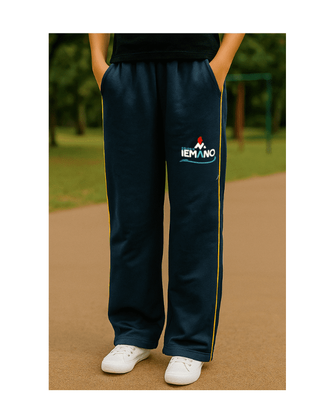 TECIDO MOLETOM COR:AZUL MARINHO COMPOSIÇÃO:50% ALGODÃO 50% POLIESTER FRISO AMARELO LATERAIS BOLSOS NAS LATERAIS LOGO BORDADO FRENTE PERNA ESQUERDA